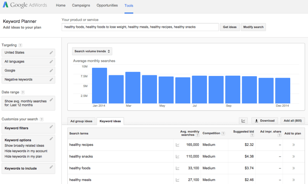 Next, take all the long-tail phrases you’ve come up with and put them into the Google Keyword Planner.